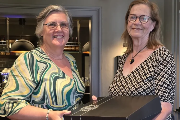 Red Button team member, Carol (right), presents a hamper to Competition winner, Wendy (left).